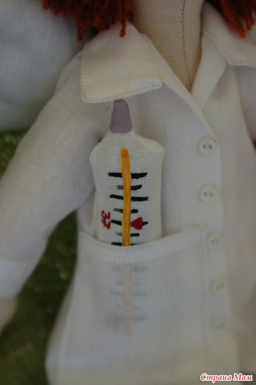 Ее высота 34 см. Она умеет сама стоять.Решила немного поиграться с деталями и сделала ей градусник и клизму