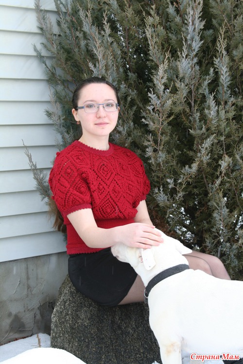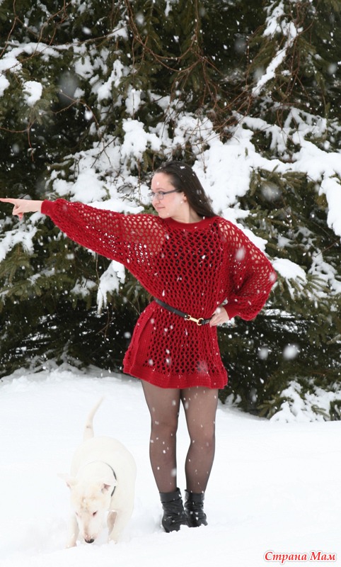 Туника -платье связана обычной сеткой на спицах. Пряжа мериносовская шерсть, арановая. Обвязка столбиками без накида. Ну и собака моя Гектор, бультерьер