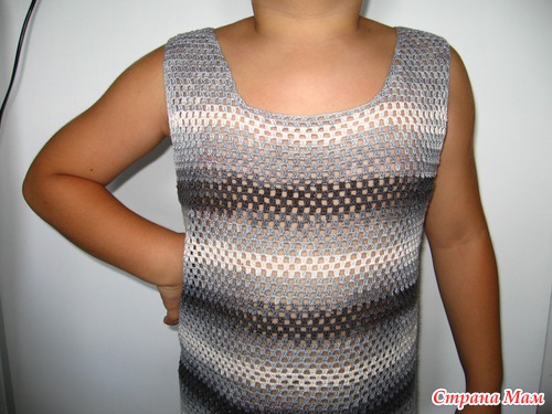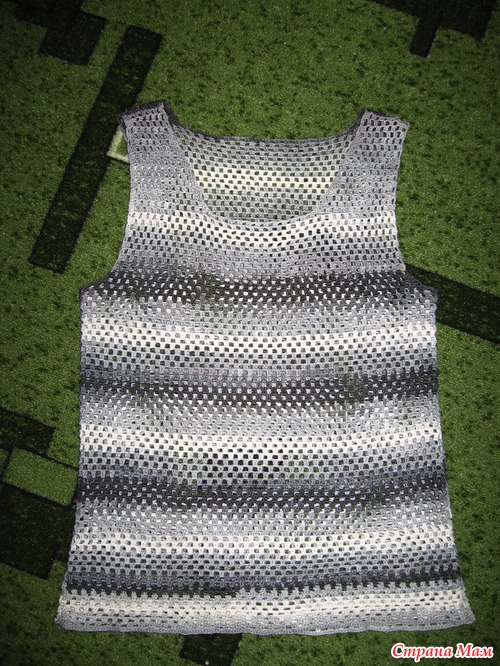 Да, крючком. Узор 3 ст.с накидом из одной, 2 воздушные. Если надо пороюсь в схемах. Вязала по кругу до пройм поворотными рядами. Потом отдельно спинку и перед. Мерила по маечке обычной белой и убавления все на глаз. Это одна из первых моих вещичек, поэтому методом проб и ошибок. Носили три сезона
