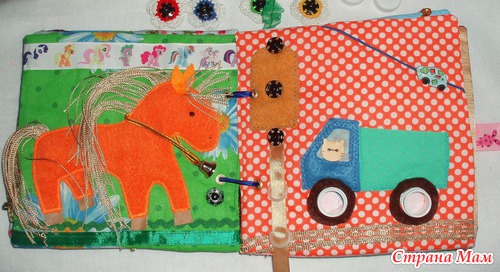 Страничка Лошадка Гриву можно заплетать и завязвать резиночкой. Колокольчик звенит. Внутри тела лошадки пуговка, можно двигать.