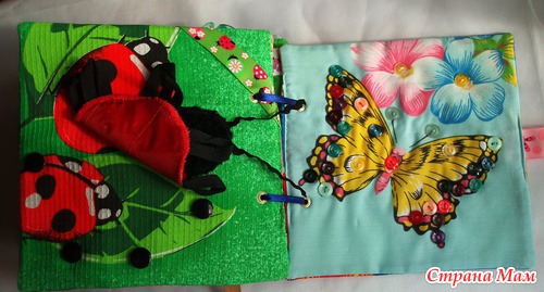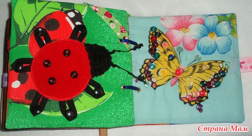 Страничка Божья коровка Лапки пуговки, головка из меха, глазки пуговки. Можно искать и считать божьих коровок на фоне и тесьме.