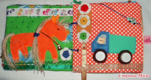 Страничка Машинка Колесики - крышки. В кузове карманчик. Светофор на кнопках. Изучаем цвета и выбираем цвета для светофора, которые представлены вязанными цветочками. Вообще их четыре. Нужно выбрать лишний и отдать его лошадке. Машинка-пуговка может перемещаться по веревочке. Столб светофора - шнуровка.
