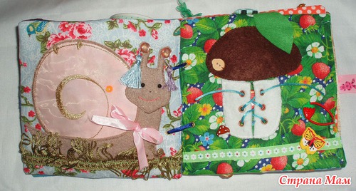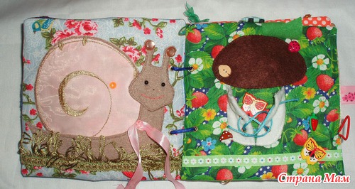 Страничка Улитка В панцире можно катать бусину. Бантик завязывать/развязывать. Можно одевать на рожки сережки. У улитки есть маленький металлический детеныш, сидит в траве.