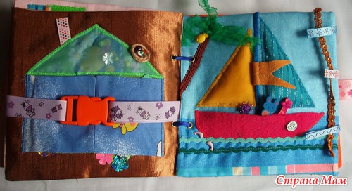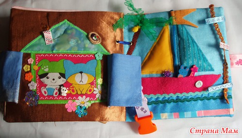 Страничка Кораблик Флаг может пониматься/отускаться. В лодке карман и пассажиры: жираф и зайчик. Также интересный элемент - пальма. Присутствует шнуровка. Различные пуговки в морской теме.