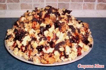 На большое блюдо высыпаем слой крошки. Слегка поливаем тонкой струйкой сгущёнки, сверху я полила смородиновым вареньем с целыми ягодами. И рассыпаем часть запаренного мака.