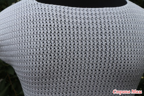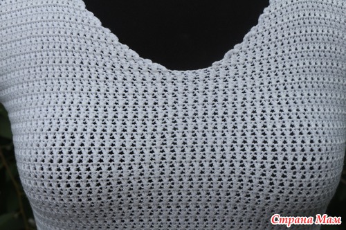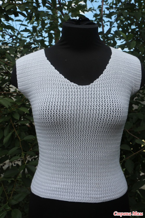 Связала топик. Оказался чуть маловат, увы. Есть желание продать. Пряжа итальянская вискоза с эластаном. Очень мягкий, в жару прохладный, садится по фигуре. Цвет чисто белый. Размер 42-44. Кому интересно, жду в личке.