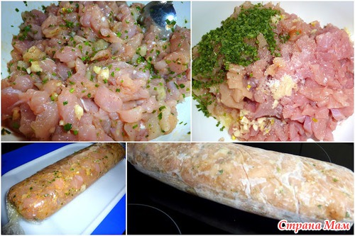 • Грудки мелко порезать, добавить яйца, манку и чеснок с зеленью, кефир, соль, перец.