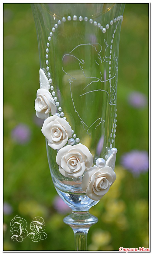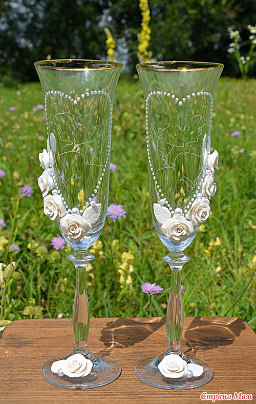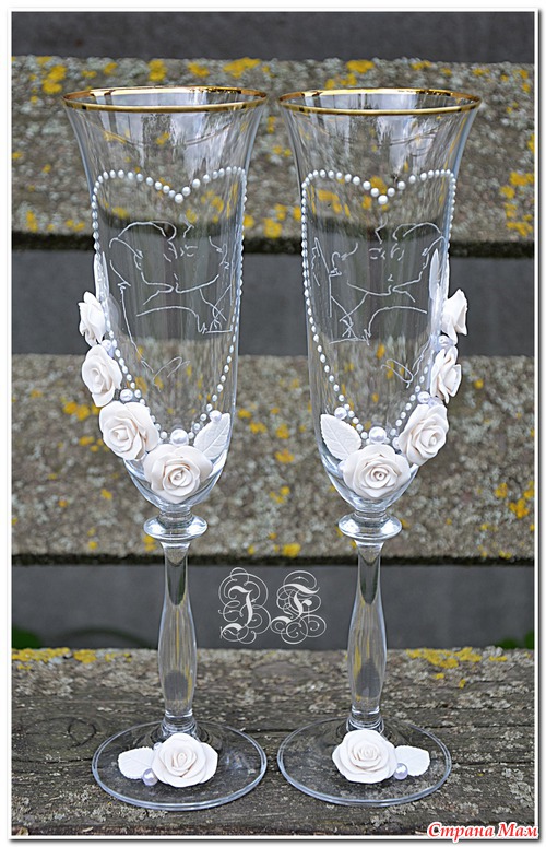 Прежде я бокалы делала всего один раз - и те себе, на свою годовщину свадьбы. И вот увидев мои, девочка захотела себе такие же. Но мы легких путей не ищем, вечно добавляем себе сложностей. т. к. повторяться точь в точь мы не любим, хотя форму и содержание я сохранила. Бокалы еще и лентами были украшены - белыми с золотистой каемочкой, но итоговый результат я не запечатела, не успела, бокалы ушли в руки заказчика.