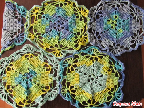 Вяжу кофточку из мотивов и хотела спросить у вас как лучше оформить горловину, у меня получается 5 мотивов на обхват талии, то есть 2,5 спереди и 2,5сзади, а с горловиной не знаю что делать, как лучше вязать, половинки мотива или другим узором, может кто то вязал похожие модели.