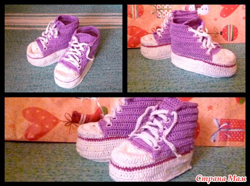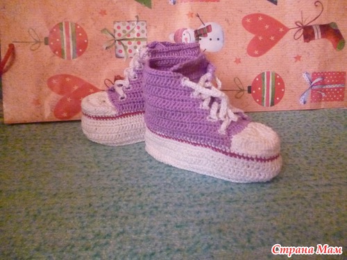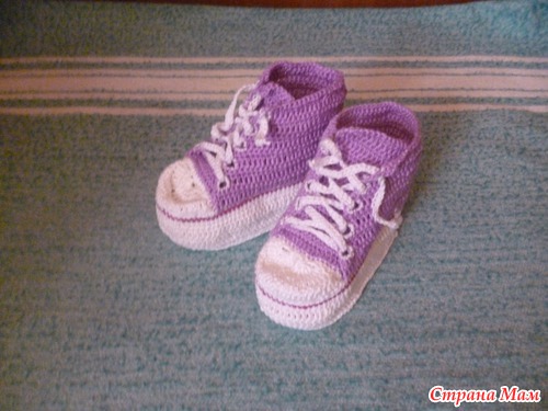 Работу вывернуть назад на лицевую сторону Обвязать подошву (верх 3-его ряда) по кругу мёртвыми петлями Работу при этом следует держать подошвой кверху Шнурки вязать в одну нить