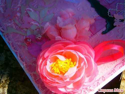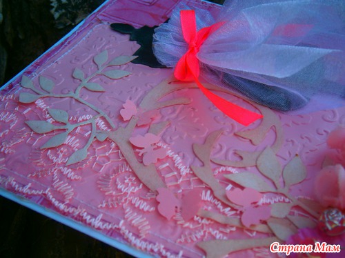 Ну а это открытка по заданию одного из блогов. Главные элементы задания: розовый цвет, бант и атрибут швеи. Бант присутствует, розового в избытке, атрибут швеи - манекен и ткань.