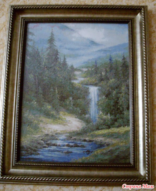 Теперь подробнее о каждой. "Водопад" вышивается в одну нить, канва №18, много просто множество одиночных крестиков. Для меня это самая сложная картина, повторить на бис уже не отважусь. Размер 39*29см,37 цветов.