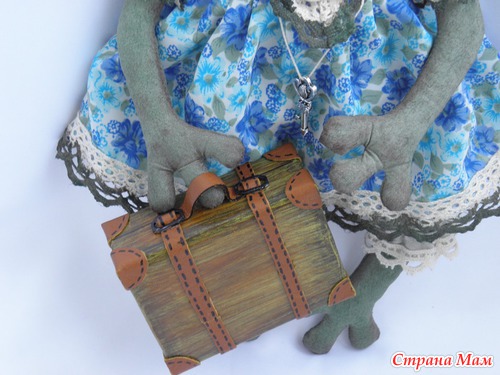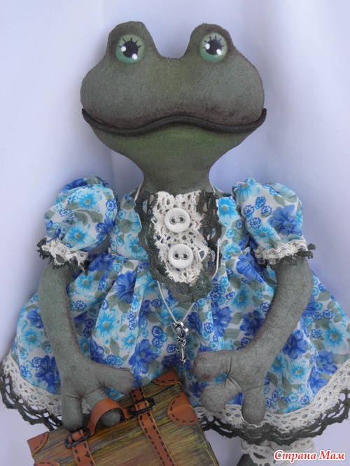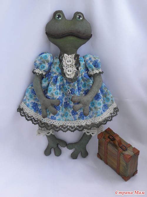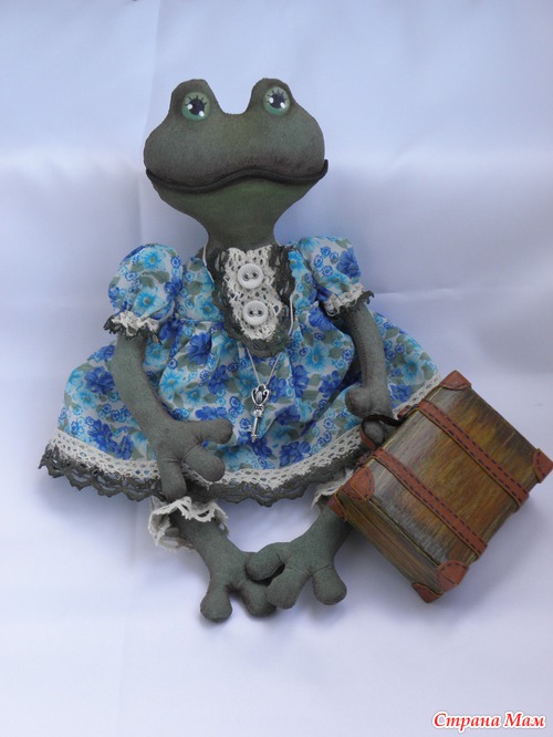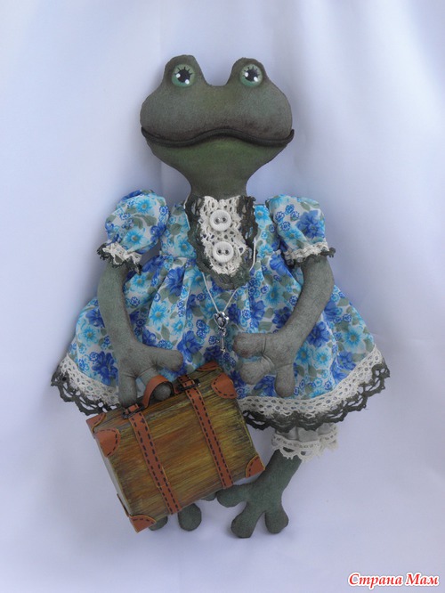 Собираюсь в гости к подружке ехать, а она коллекционирует лягушек разных. Ну вот я и пошила ей подарок. А так как подруга жить не может без путешествий, то и думать долго не пришлось. Конечно же лягушка -путешественница!!! Очень хотела винтажную сделать, но думаю не очень получилось, хотя мне и так нравится :-) Рост 27 см. Чемоданчик высотой 6см. Тонирована акриловыми красками.