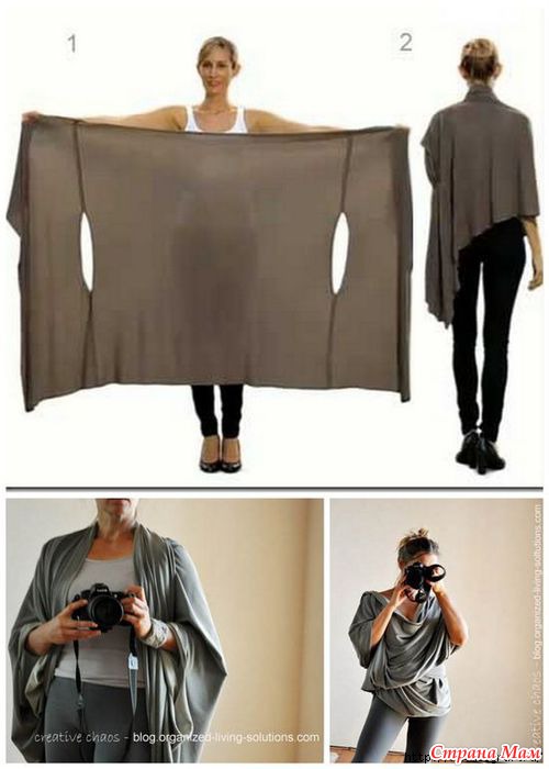 Обращаться с этой вещицей нужно смело, легко и непринуждённо. Перекручивать, вставлять одну руку в обе проймы. Переворачивать, Собирать у шеи, как шарф. Короче, на что только хватит фантазии, - пробуйте все варианты!
