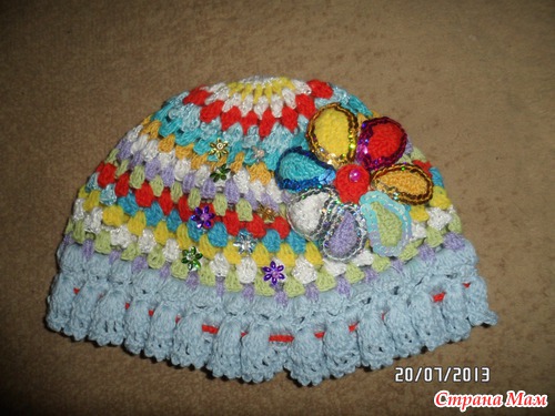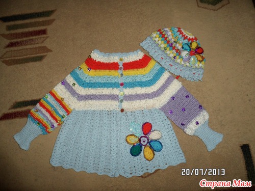 Связалась шапочка из остатков ниточек в комплект к кофточке, ранее ее уже выставляла.