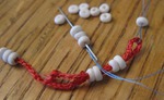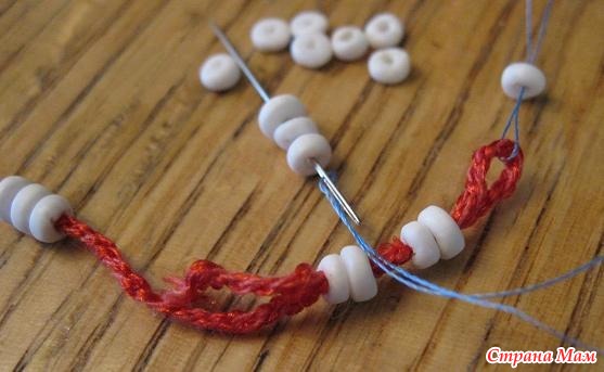Проденьте нить в иголку для бисера и завяжите, чтобы образовать петлю, в которую, как в игольное ушко, мы проденем пряжу. Нанизывайте бусины на иголку, сдвигая их на швейную нитку, а затем на пряжу. Продолжайте, пока не получите желаемое количество бусин. После некоторой тренировки у вас получится нанизывать несколько бусин за один прием.