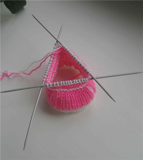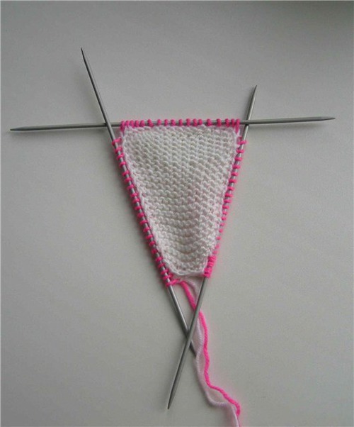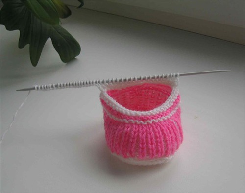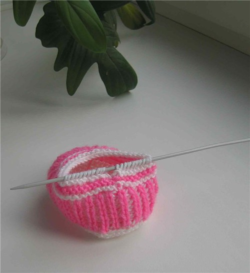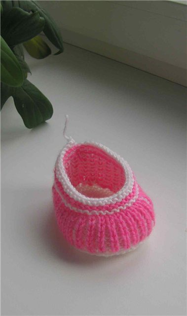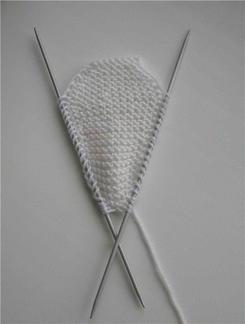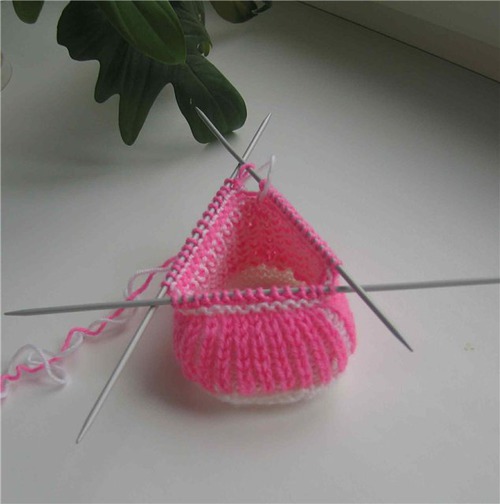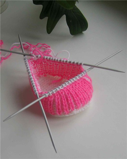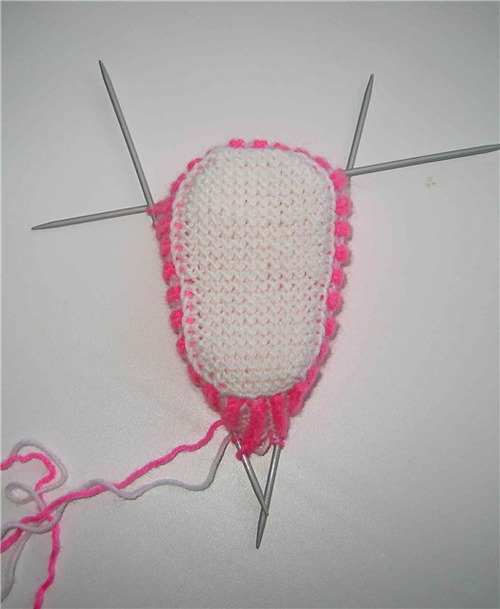 Набрать по кругу подошвы петли так, чтобы на мыске было 18 петель, на двух боковых спицах по 21 петле (всего 60петель)