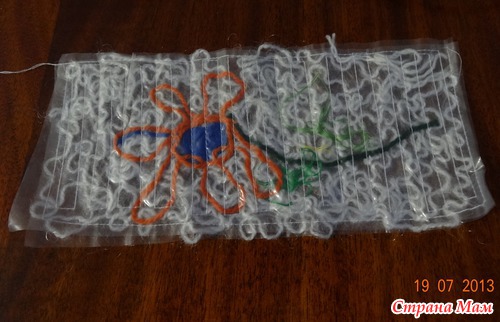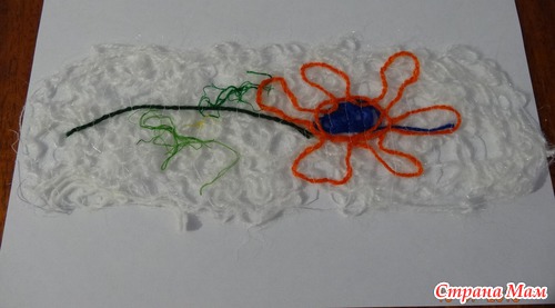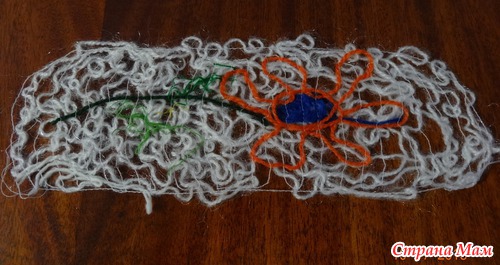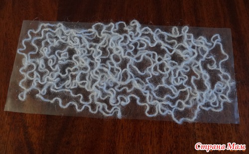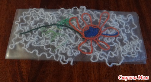 На флизелине размещают шерстяные нитки (пряжу), приутюживают, после этого опускают в воду. Флизелин растворяется, а рисунок остается. Как-то так делается