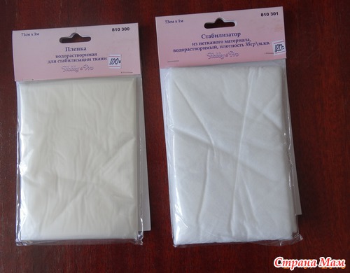 Техника крейзи-вул мне понрвилась, поэтому начались поиски растворимого флизелина, которого я так и не нашла. Будучи в Краснодаре попыталась искать и там, но увы, не был обнаружен. Зато, благодаря продавцам рукодельного магазина, узнала о существовании не менее интересных и нужных материалах: "Пленка водорастворимая для стабилизации ткани", "Стабилизатор из нетканого материала, растворимый" и пленка растворимая для вышивки метражом.