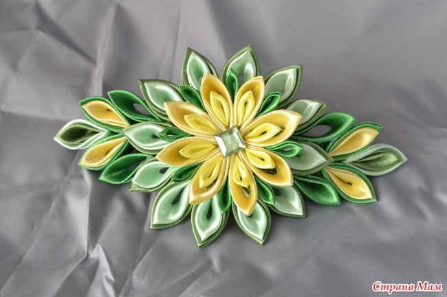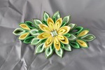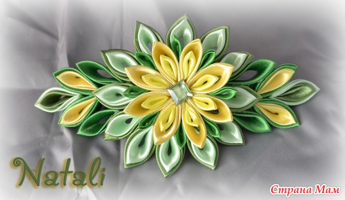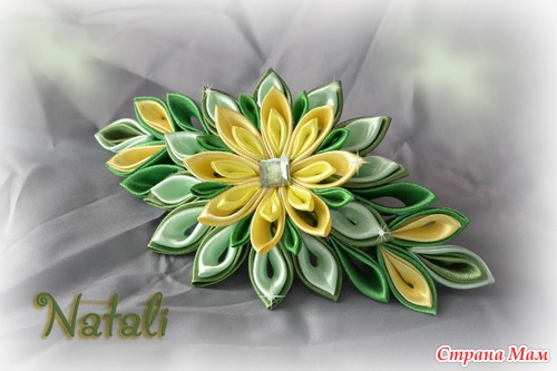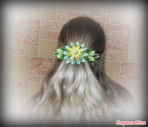 Остались ленточки думала сделать из них зажим для волос, в итоге передумала на заколку-автомат, и название сразу в голову пришло- "На лужайке" Пойдет, как думаете? Может кому понравится, и захочет себе приобрести!! А вот как смотрится на самой прически: