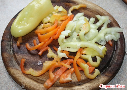 Режем перец и добавляем к луку