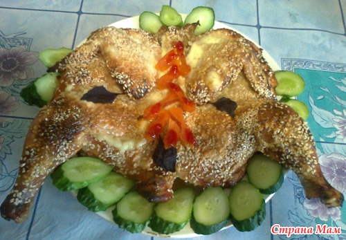 Потом смазываю противень маслом, кладу куру, распластав как для цыпленка-табака. Сверху можно еще сметанкой мазнуть, я еще кунжутом посыпала.