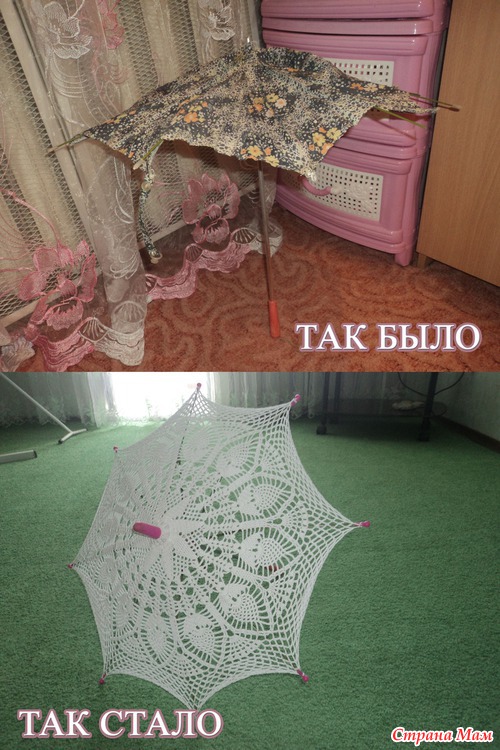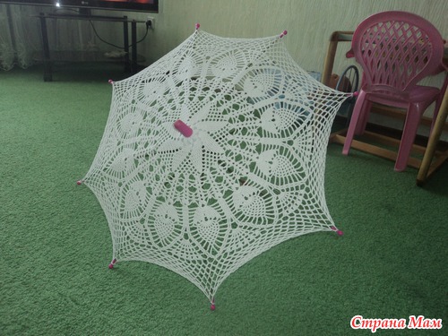 Мама моя принесла дочке детский зонт, тряпочный такой, древний, неизвестно каких времен, точно не времен моего детства. Ткань вся выцветшая, порванная местами, а я давно мечтала зонтик связать, только не было основы, покупать специально не хотелось. Вот и сбылась моя мечта. А то, что получилось смотрите сами. Родные наконечники на спицы сломались, пришлось от сломанного детского современного зонта позаимствовать, ну для гармонии и верхушку позаимствовала.