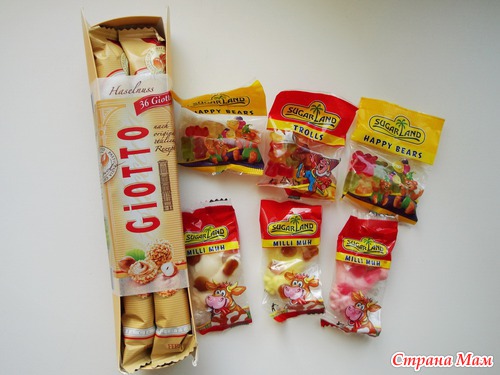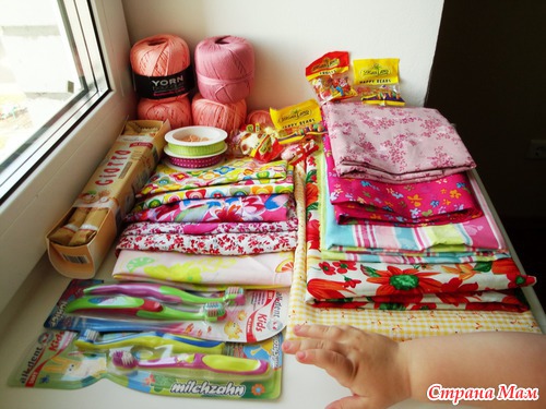 Вот Галине и захотелось порадовать меня подарком. Прислала мне издалека отрезы яркой хлопковой ткани, пряжу, фурнитуру, сладости и красивенные зубные щётки для моих детишек. В переписке Галина говорила про маленький сюрприз, а тут пришла большая коробка с таким сюрпризищем!