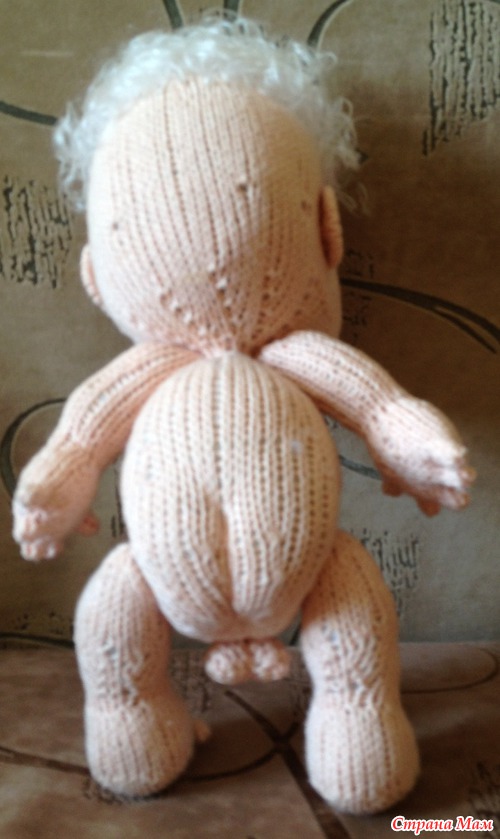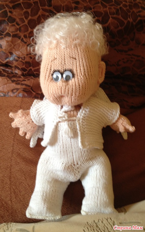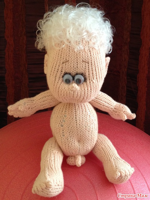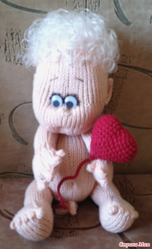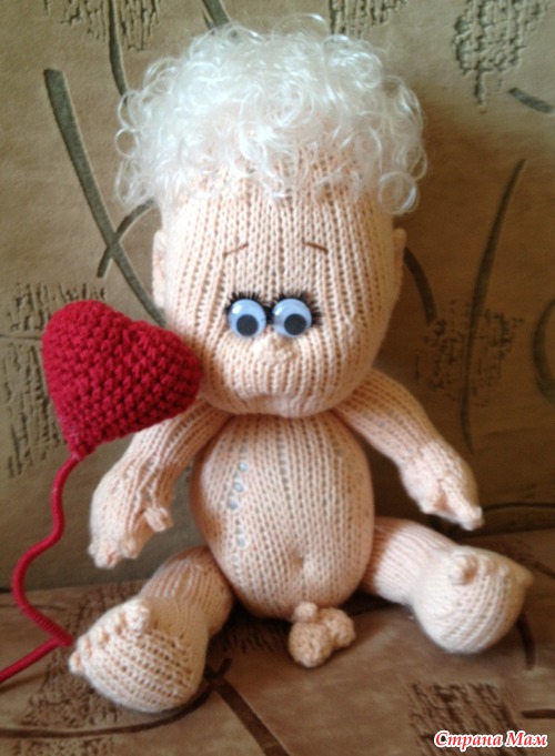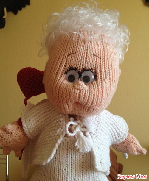 Пару месяцев назад вязался у меня такой пупсёныш-ангелочек спицами по описанию Марины Голден, за что ей большое спасибо!