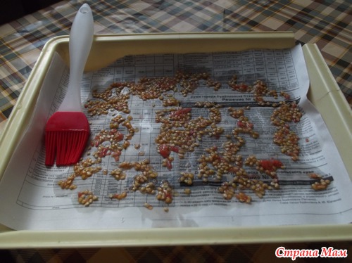 Разложить (размазать) на газету одним слоем и поставить сушить. Очень удобно это делать кисточкой. Как только газета впитала в себя всю влагу и сама немного просохла (семена стали суховаты, но уже не скользят по бумаге), я ложечкой соскабливаю (вернее, смещаю с места) и оставляю до полного высыхания.