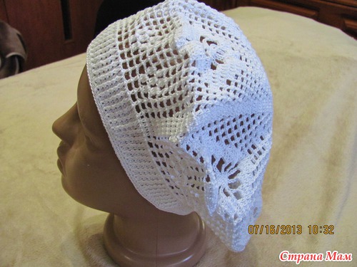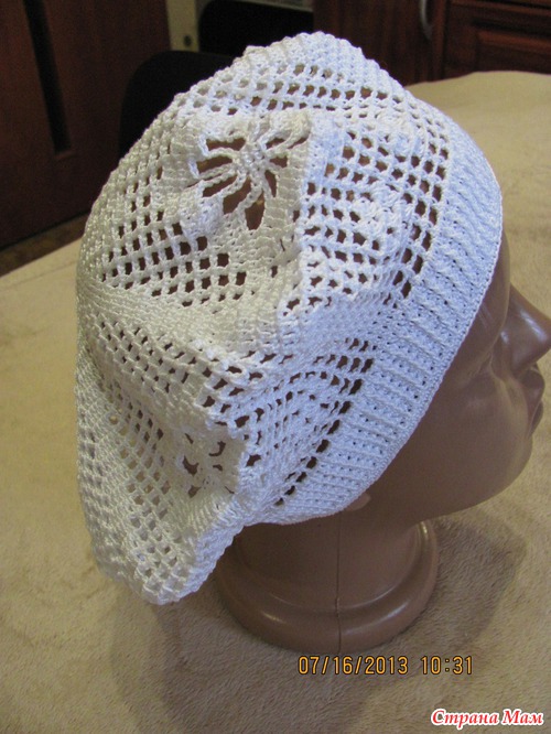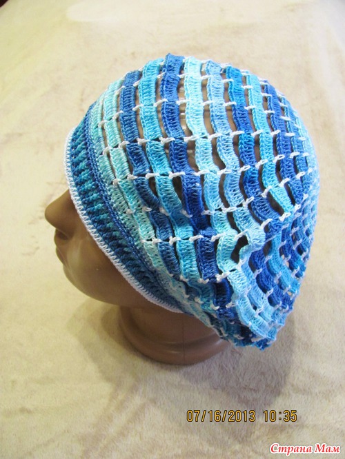 ! Как-то этим летом меня накрывают волны с головой, то я вязала шляпки... теперь вяжу береты... хочется все перепробовать... По-моему не удивительно, тут постоянно соблазняют разными чудесными моделями, глядя на которые, непременно возникает желание СРОЧНО связать, и ты хватаешься за крючок... У Вас тоже так?На Лесенку давно смотрела, нравится своей простотой, а смотрится на голове эффектно, добралась до нее. Ниточки Ализе Мисс Батик №3702 и немного белых той же марки, крючок 1.5 Такой морской получился, но мне цвет очень нравится