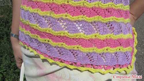 Топ связался на спицах, из пряжи Вита, мерсеризованный хлопок. Подобрала три цвета, Узорчик такой, чтобы и ажурно, и с волнами. Решила вязать просто прямоугольниками - так и убавлять не надо. Обвязку и бретели связала крючком.