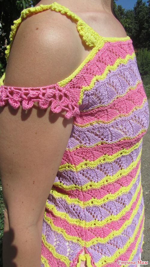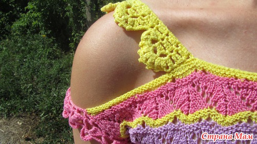 Топ связался на спицах, из пряжи Вита, мерсеризованный хлопок. Подобрала три цвета, Узорчик такой, чтобы и ажурно, и с волнами. Решила вязать просто прямоугольниками - так и убавлять не надо. Обвязку и бретели связала крючком.