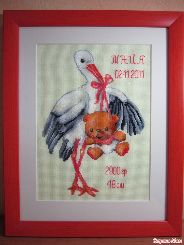 Эту метрику с аистом я вышивала для малышки моей лучшей подружки. Сюжетик выбирала подружка сама, а мне осталось только воплотить ее желание. Сейчас вышиваю еще одну метрику для ее второй дочурки.)