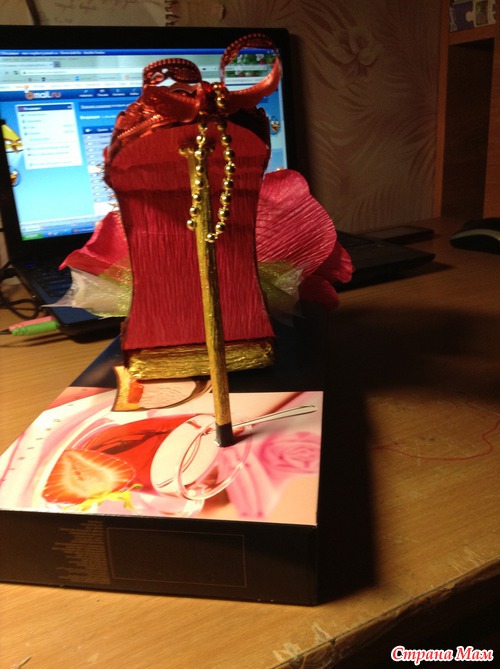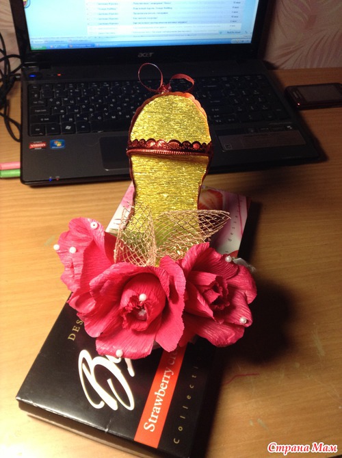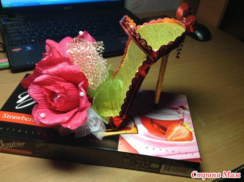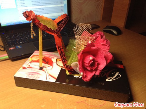 Именно этой нету,я вчера на скорую руку делала,когда малыш спал,здесь посмотрите,на него опиралась:http://hobbyndom.ru/mk-tufelka-iz-konfet/,только у меня и платформа из картона(4 слоя),а каблук из палочки для суши, а по краю я приклеила обрезки от банта -у дочки недавно был д/р,покупала много бантов подарочных,остались-у этого красивый резной край,очень пригодился,обрезала и туфельку обклеила,если что-спрашивайте