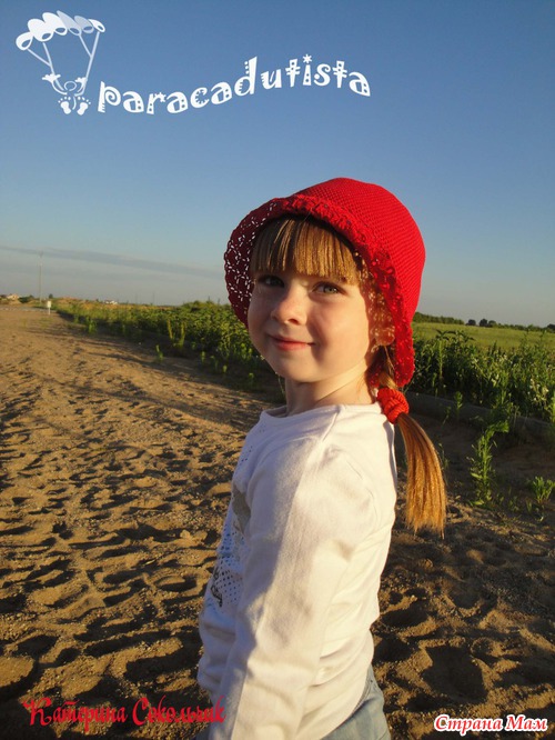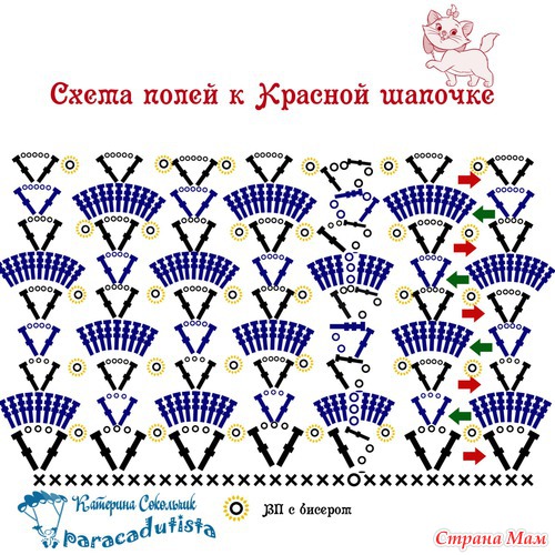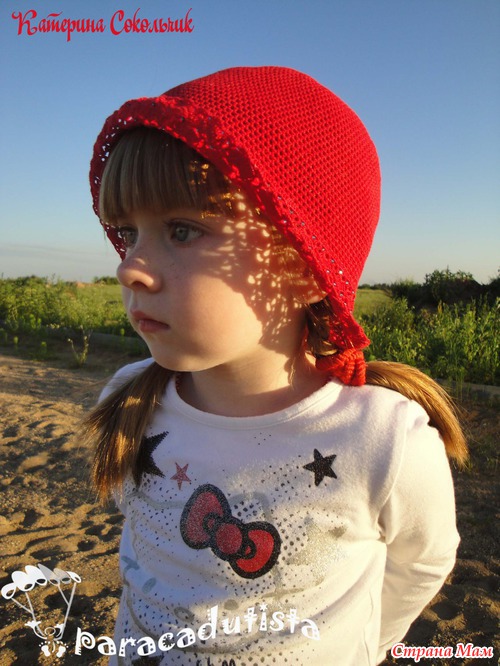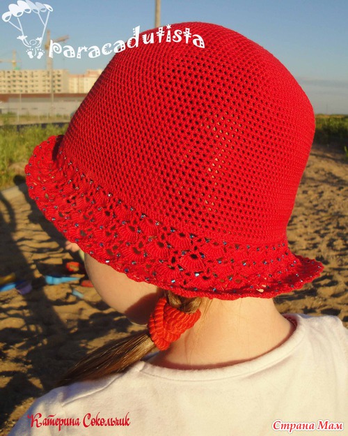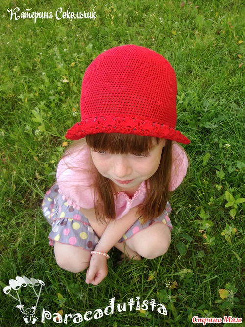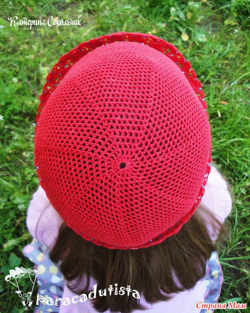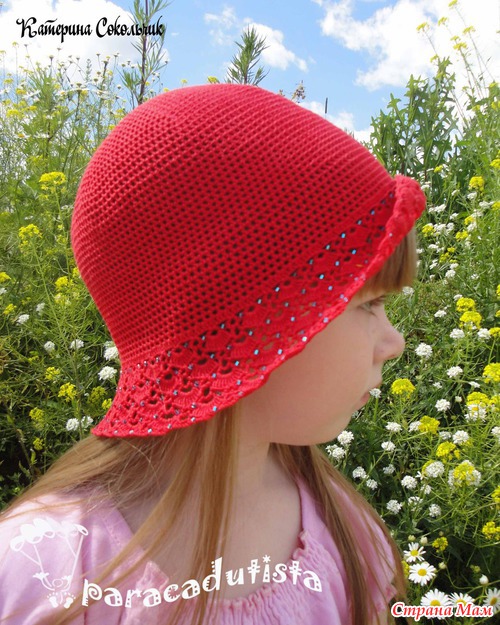 Поля шапочки придумывала сама на основе схемы для прямого полотна. В них ввязан чешский бисер рубка. На солнце от сверкает так!!! издалека видать!!!