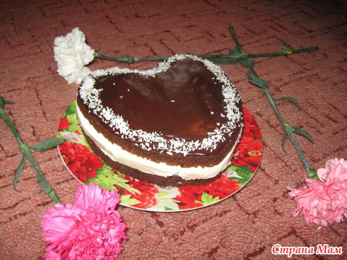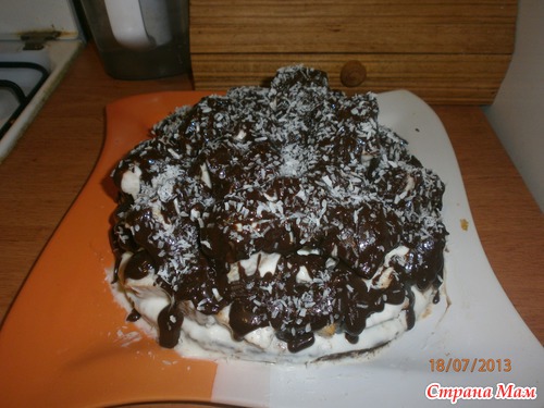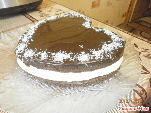 Разделить на 2 части, в одну из которых добавить 3 ч. л. какао. Выпекаем. Белый корж режем на кусочки. Каждый кусочек обмакиваем в крем и выкладываем на коричневый корж горкой.