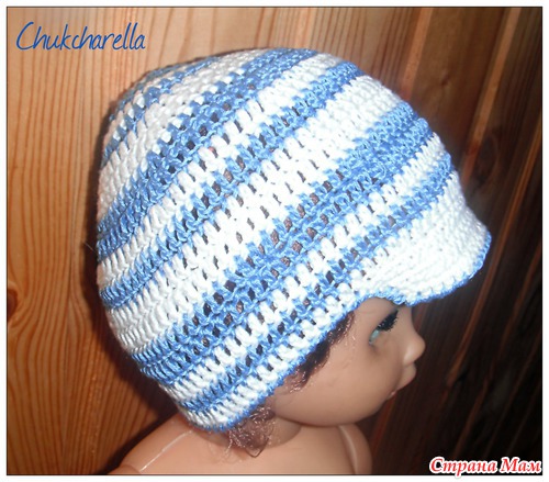 где столбики с накидом..слева схема..чередовала синим-два .белым два..потом по одному ряду..козырек вязала так..на возраст от 0-3 ... одна вп. пропускаем одну петлю.четыре ст б.н. в следующие четыре петли..два ст б н в следущую петлю.12 ст б н в следущие петли. два ст б н в следущую петлю..четыре ст б в следущие петли.и два ст. б. провязать вместе. переворачивпем. в обратную сторону- одну вп. след. петлю пропускаем..до последних двух петель вяжем ст б н.. последние две- вместе..и вяжем так чередуя эти ряды))