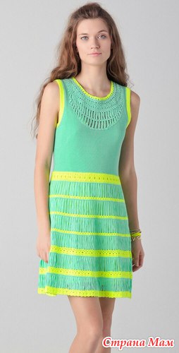 Переходим к горловине. Здесь нужны петли поменьше. Я достала из шкафа подходящий тонкий поясок. Конечно, здесь можно было и столбиками с накидом провязать темный ряд, но зачем портить концепцию нашего платья?