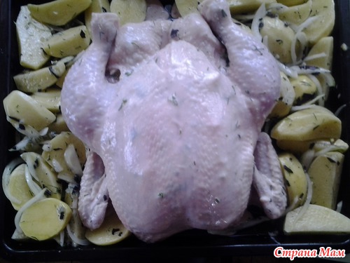 Уложили курочку на противень на спинку, вокруг разложить замаринованную картошку и поставить в духовку при 190 гр, запекать до готовности, дома у меня получается 50 мин, на даче почти 2 часа, по этому ориентируйтесь на свой агрегат