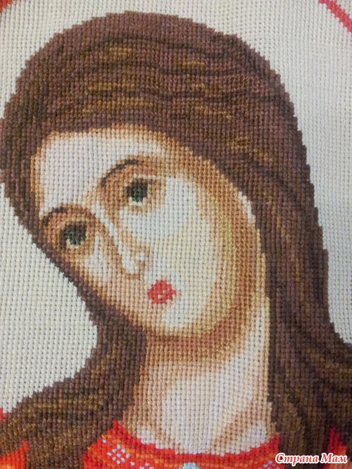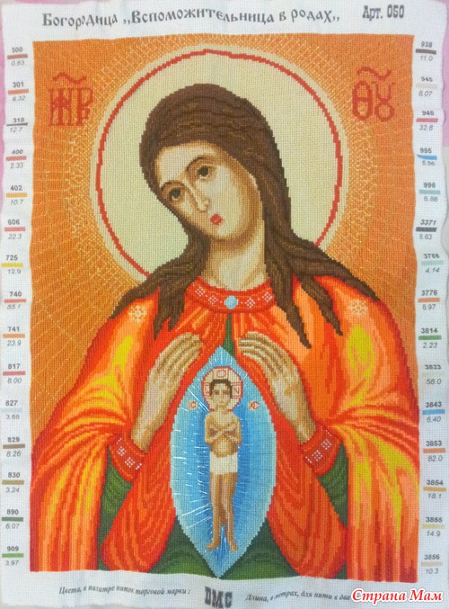 . Набор из канвы с рисунком и символьной схемой передавалась по цепочке: соседка моей матери - моя мать - я. Соседка, что-то покупала в швейном магазине и ей в подарок дали набор. Поскольку она не вышивальщица, а вязальщица, то передала ее мне через маму. Но никто даже не обратил внимания на название иконы "Богородица Вспоможительница в родах"