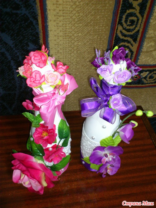 Добрый день, девочки! У меня свадьба в сентябре. Захотелось мне самой подготовить свадебные аксессуары. Первым делом оформила бытылки шампанского. Делала это впервые. Прошу оценить мои старания. Критика принимается.
