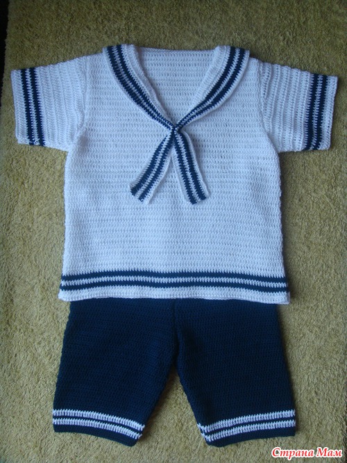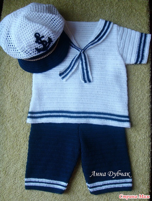 Комплект "Морячок" связан на малыша 6-9 мес. Пряжа белая Мисс от Ализе, синяя Форевер от Ализе. Расход по 2,5 моточка каждого цвета. Крючки №1,3 и 1,5. Спасибо девочкам за подробные мастер-классы: по костюмчику https://www.stranamam.ru/post/5777457/ и по фуражке https://www.stranamam.ru/post/3127739/
