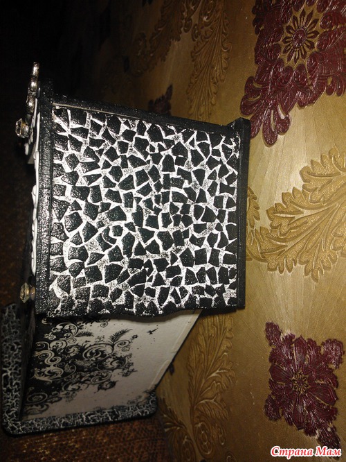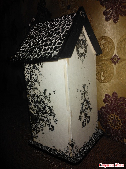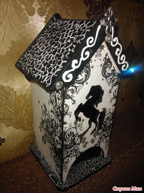 Пятый этап назывался "Мечта сбывается" Нужно было сделать что-то, что давно хотелось, но руки никак не доходили. Я давно хотела попробовать чёрно-белый декупаж, вот и сделала его, задекупажила чайный домик. Вот что получилось