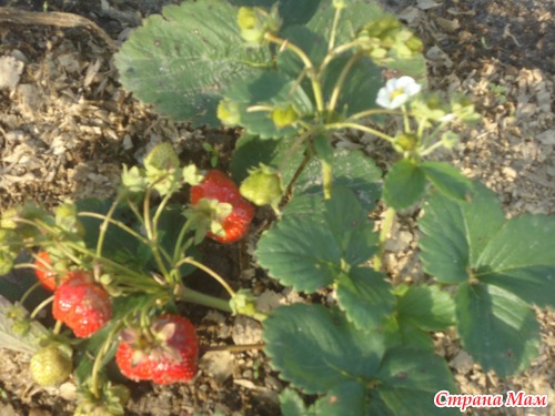 Вот клубника (2 год- урожай небольшой) На земле слой опилок.