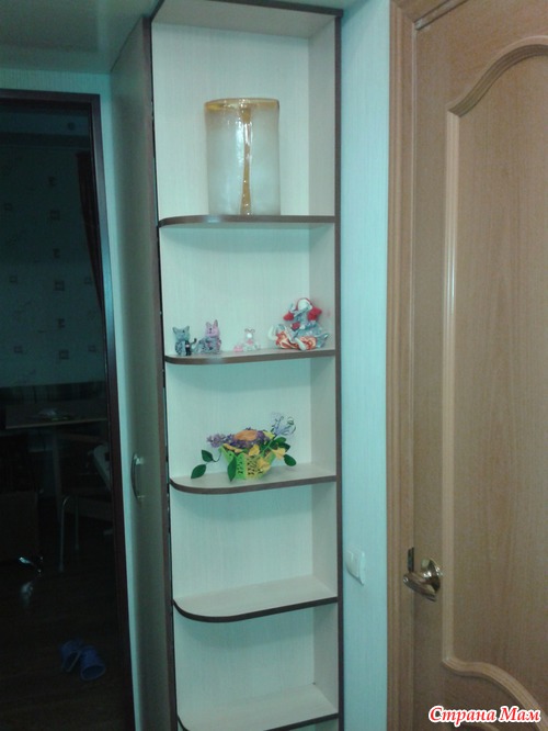 С какого бы угла начать? Итак, стою у входной двери, в объективе - уже представленный когда-то шкаф-мегаобувница-стеллаж. Рядом проем - это вход на кухню, дверь - в санузел