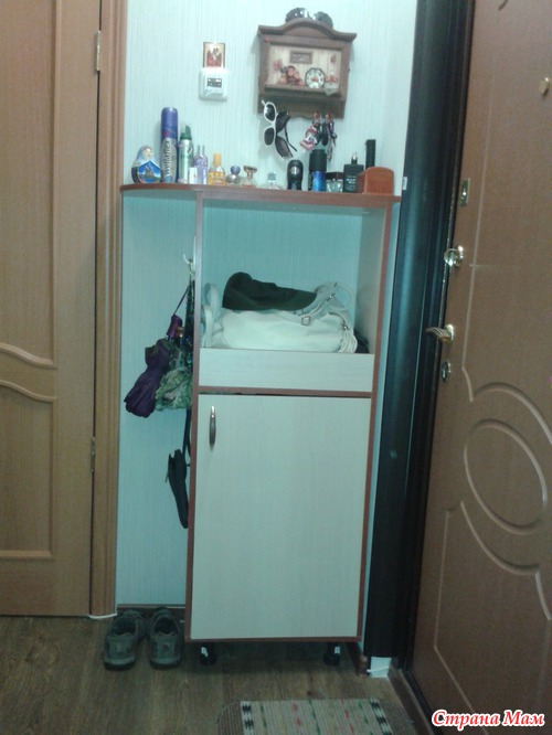 ) шкафика. Продолжаем использовать каждый миллиметр свободного пространства, сбоку - крючки под всякие барсетки-зонты и почему-то, Ксюхины поделки