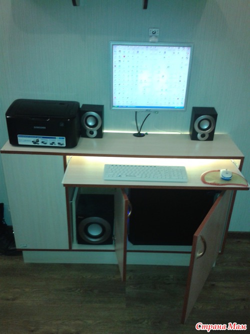 В нижнем отсеке - системник и сабвуфер. Клавиатура с мышью обретаются на выдвижной доске, которая к тому же, обладает подсветкой (включается сама при выдвижении доски). Кнопка включения компа выведена на стол, прямо под монитором