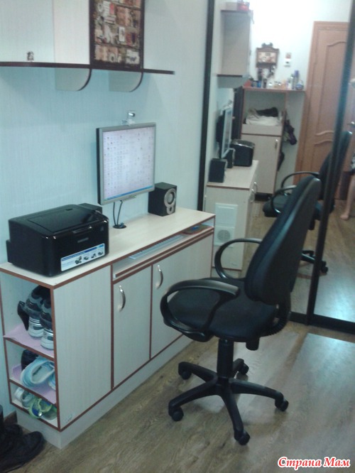 Квартира у нас однокомнатная. В целях экономии места, здорового сна и бОльшей фэншуйности, мы решили комп выдворить в прихожую. Муж сам сконструировал узкий (ширина - 30см, длина - 120см, высота - 60см) компьютерный стол (сбоку - место для хранения повседневной обуви). На верхней поверхности умещаются принтер, колонки и чашка кофе. Монитор висит на стене. Последне приобретение - крутящееся кресло. чудо! Можно ногу задрать, откинуться и расслабиться. Раньше стоялаобычная табуретка, суровая и беспощадная