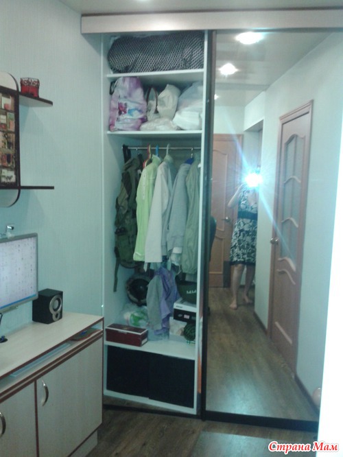 Наша радость: шкаф-купе-прихожая. Муж сделал ее еще год назад, а двери зеркальные они с другом сообразили пару дней назад. В течение всего года единственным зеркалом в доме было то, что в шкафчике ванной комнаты.